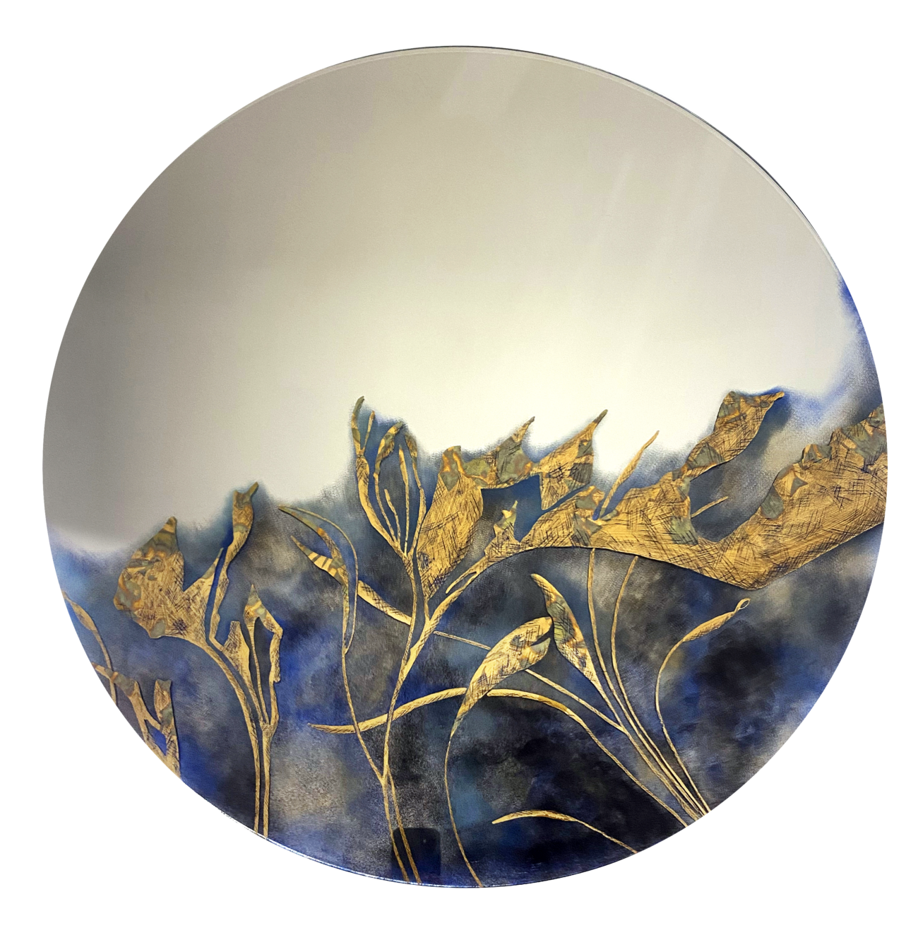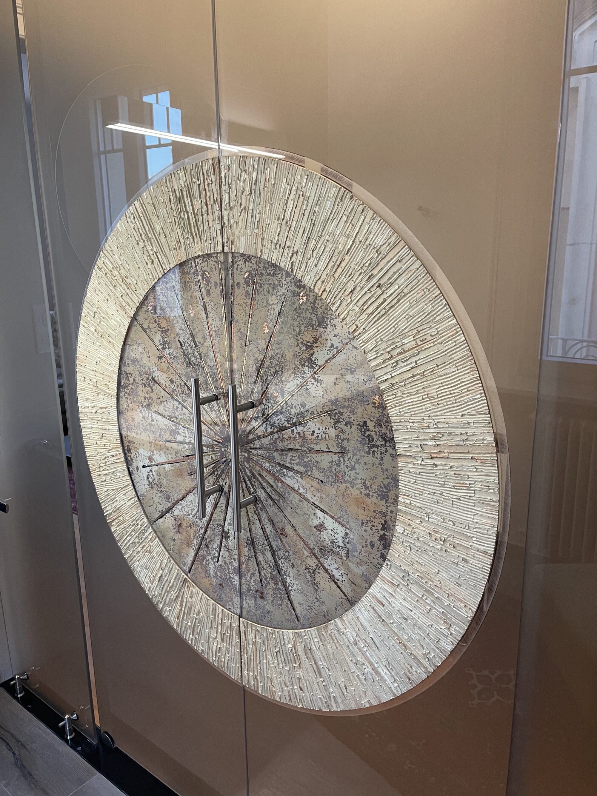Solution artistique sur mesure réalisé à la main, gravures, effets de matières, travail de feuilles d'or, argent, inspiration verre églomisé, choix des matériaux supports, textures et coloris.